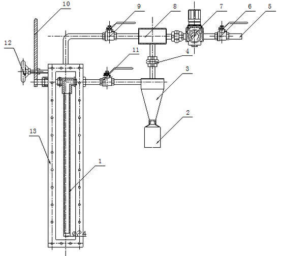 自吸式煤粉取樣器用于直吹式制粉系統(tǒng)一次風(fēng)煤粉管道上定期煤粉取樣,在1000MW、600MW及以下機組中都有廣泛應(yīng)用。采用壓縮空氣吹掃和用抽氣器抽吸取樣,避免了取樣口堵塞問題的出現(xiàn),且易于取樣。取樣的速度通過控制壓制空氣壓力而得到控制。這樣可以得到較準(zhǔn)確的、具有代表性的、等速的煤粉細度值。