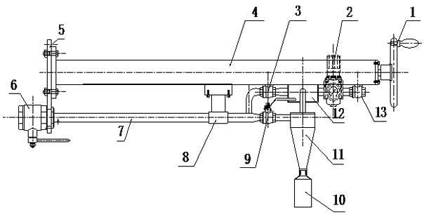 1、手輪;2、壓縮空氣調(diào)壓閥;3、球閥;4、傳動管;5、板;6、球閥;7、取樣管;8、連接裝置;9、球閥;10、取樣瓶;11、旋風分離器;12、射氣抽氣器;13、球閥