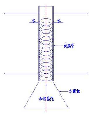 旋膜除氧器與噴霧填料式、淋水盤式等其它類型的熱力除氧器在性能上存在著根本性不同,其關(guān)鍵之處在于增壓旋膜器結(jié)構(gòu)汽水傳熱傳質(zhì)方式,凝結(jié)水及補(bǔ)充水進(jìn)入除氧頭內(nèi),增壓旋膜器、溢流裝置組合成水室,在0.2MPa的壓力下水從增壓旋膜器的螺旋小孔斜旋噴向內(nèi)壁,形成水膜裙與自下向上的一次加熱蒸汽在管內(nèi)熱交換,水在射流運(yùn)動中和加熱蒸汽吸卷進(jìn)行(經(jīng)試驗(yàn)證明射流運(yùn)動具有卷吸作用)除氧。短時間內(nèi)在小行程情況產(chǎn)生劇烈的汽水混合加熱,水溫大幅度上升,射旋的水膜裙沿著旋膜管內(nèi)壁自上向下射旋,形成紙一樣薄的水膜裙(如圖所示),水膜裙與加熱蒸汽熱交換時間充分,此時傳熱傳質(zhì)效果最理想,水溫達(dá)到飽和溫度,氧被分離及時,由于旋轉(zhuǎn)水流緊貼內(nèi)管壁旋轉(zhuǎn)向下,在旋膜管中間形成汽水通道,不存在氣體流動死區(qū),因氧氣在管內(nèi)無法隨意擴(kuò)散,逸出的氧氣被從旋膜中間向流動,隨著上升的蒸汽從排氧管口排向大氣。