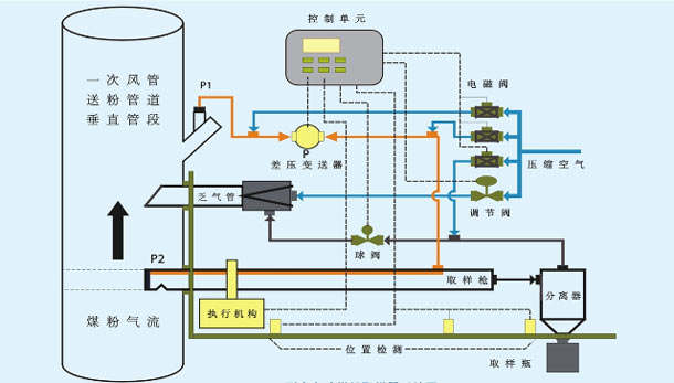該產品是利用壓縮空氣為動力,使取樣管、分離器、取樣瓶產生負壓來抽吸煤粉達到取樣目的,并可利用壓縮空氣吹掃取樣管避免取樣管堵塞的問題。每套取樣裝置內包含取樣管、乏氣管、抽氣器、分離器、調壓閥、傳動裝置、電動調節(jié)閥(進氣閥)、電動取樣閥、電動吹掃閥、可逆調速電機差壓變速器等。其中,電動進氣閥用于控制裝置內氣源的通斷,系統(tǒng)通過實時調節(jié)該閥的開度調整進氣壓力,從而使取樣管與煤粉管道的靜壓差恒定;取樣閥打開表示允許樣品進入取樣瓶;吹掃閥關閉表示允許對取樣裝置內部進行吹掃;可逆調速電機用于將取樣管推送到取樣點位置。此外,進氣管道上裝有一臺手動調壓閥,用于調整進氣壓力,用戶可通過此閥的位置調整進氣壓力上限,以起到保護電動調節(jié)閥的調節(jié)靈敏度。